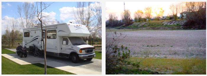 Bigfoot at the RV resort in Bakersfield, CA. Behind the RV is now a dry river, about 100 yards wide, I walk the recumbent across this sandy dry river to the bike path on the other side. It is a Great bike path. Tomorrow, Saturday, I will bike the entire path, that should give me 60 miles.