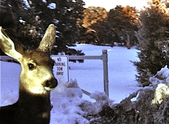 This mule deer at the Grand Canyon does not migrate; so now in the winter rangers feed them, but they don't make it look like people are feeding them, since people are not allowed to feed them, the deer don’t know they are being fed?