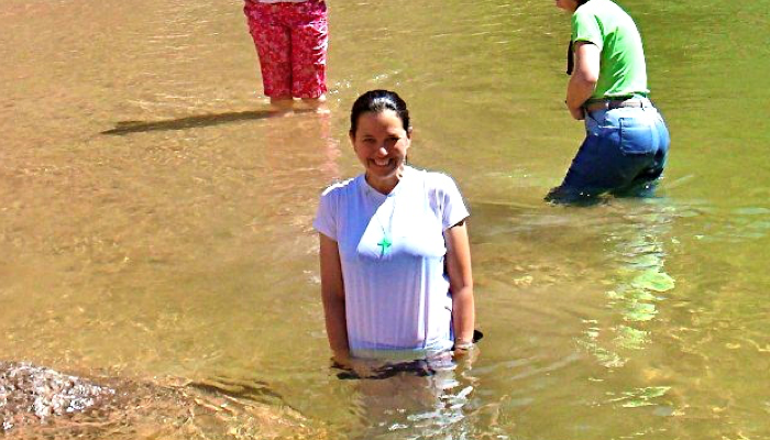 Vickie splashing in the cold Colorado River within the Grand Canyon. It was awesome to cool down in the Colorado after a short hike at the hot bottom of the Grand Canyon, I believe temp reached 102 F. Vickie always very happy when she is in an adventure.