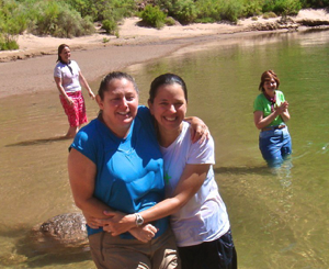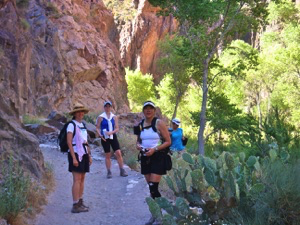 I catch-ed up with ladies at the Phantom Ranch at the bottom of the canyon. Vickie, jumped out to greet me, helped me with my pack, and served me a lemonade. The ladies were heavily engaged in a card game call “sheet head” in the cool of the cantina. Yep, they have a cantina at the bottom of the Grand Canyon, they serve beer. They have dorms, a bed (bunk beds) with bathroom/shower. We took a rest day at the Phantom Ranch and did a short hike along the river. There are a couple of bridges for walking across the river. See photo at right. It was during this hike that some of us splashed in the Colorado. Jenna, Vickie and me. On our short walk, we met a couple of ladies also taking a rest day, they were not planning to splash in the river, but seeing us convinced them that it must be fun, so in they went.